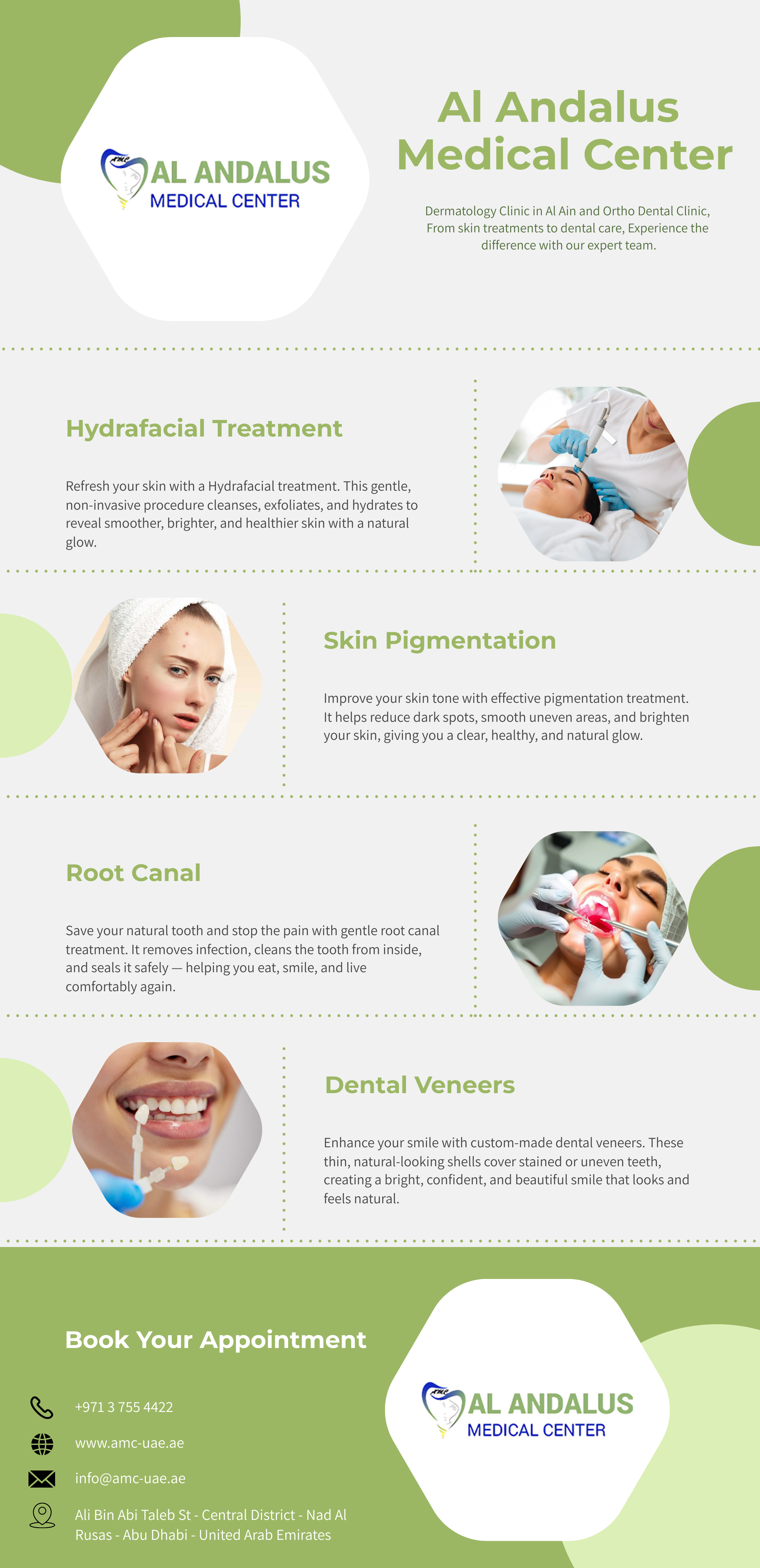Our clinic offers both dental and skincare solutions in one place. From orthodontics, veneers, and root canal treatments to Botox, Hydrafacial, and pigmentation care, all services are customized for patients. With skilled experts and advanced tools, we ensure safe, high-quality treatments that improve smiles, skin, and confidence together. https://amc-uae.ae/services/hydrafacial-treatment/