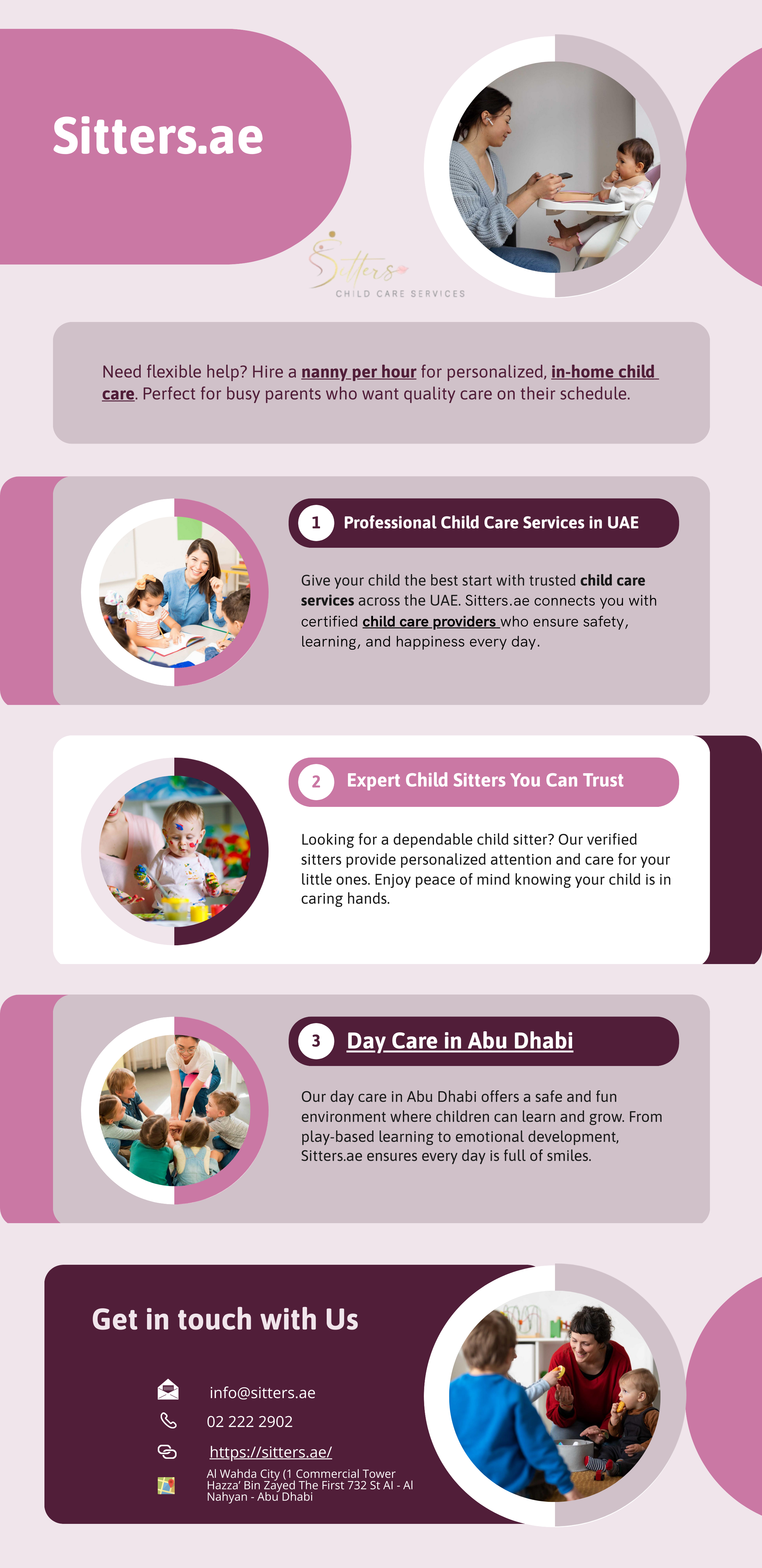 Looking for trusted child care services in the UAE? Sitters offers comprehensive solutions for every family’s needs, ensuring safety, comfort, and development for your little ones. Our team specializes in child care and development, helping children grow in a nurturing and stimulating environment. From newborn sitting to daily baby care UAE, we provide personalized attention tailored to each child’s needs. Parents can rely on our expert staff for dependable baby care, making every moment safe and joyful. As a leading nanny agency Dubai UAE, we connect families with qualified and experienced caregivers. Whether you need a full-time nanny UAE or a flexible nanny per hour, our services are designed to fit your lifestyle seamlessly. Trust Sitters for professional, loving, and convenient childcare solutions that give both children and parents peace of mind.