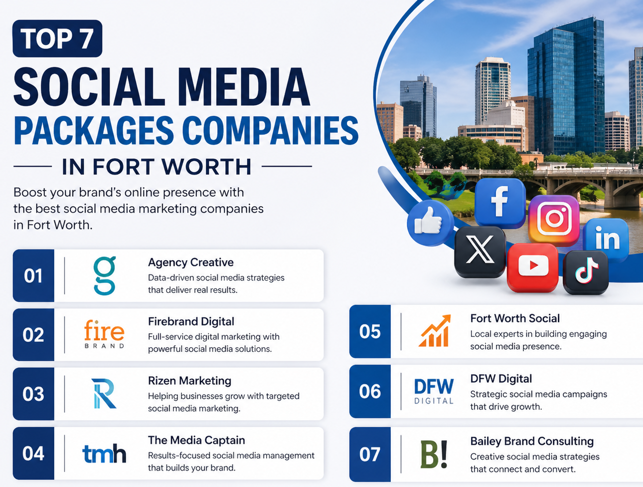 Below is a detailed list of the Top 7 Social Media Packages Companies in Fort Worth that provide result-driven services, creative strategies, and scalable solutions.