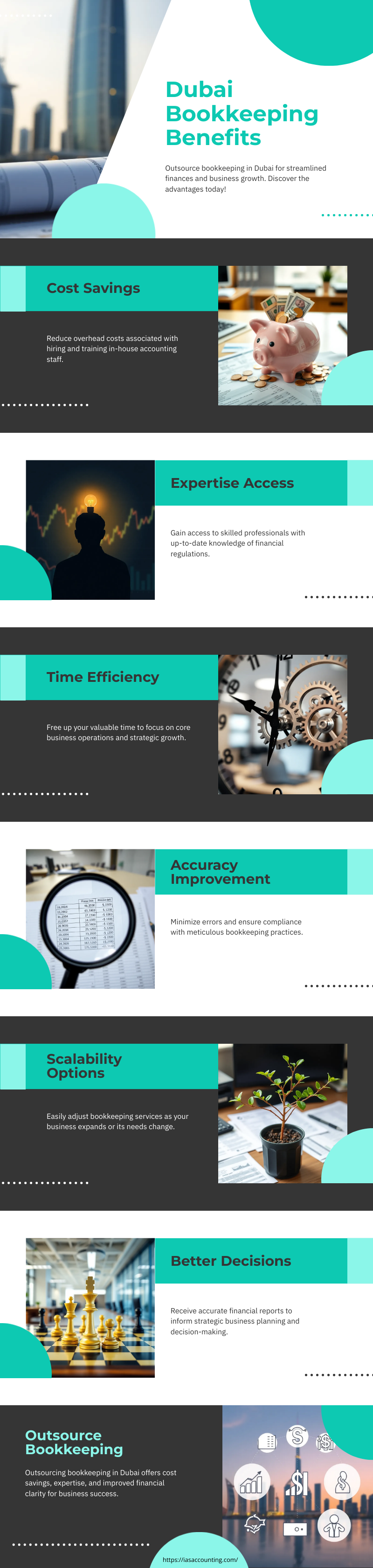 The key benefits of outsourcing bookkeeping services in Dubai, including cost savings, expert support, and improved time efficiency. It also emphasizes enhanced accuracy, scalability, and better financial decision-making for sustainable business growth.